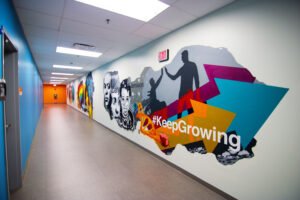 - Logo Firmy: Jednym z najczęstszych zastosowań druku na ścianie w biurze jest nadrukowanie logo firmy. Logo umieszczone na widocznej ścianie od razu przyciąga uwagę i stanowi doskonałe narzędzie budowania świadomości marki zarówno wśród pracowników, jak i odwiedzających.